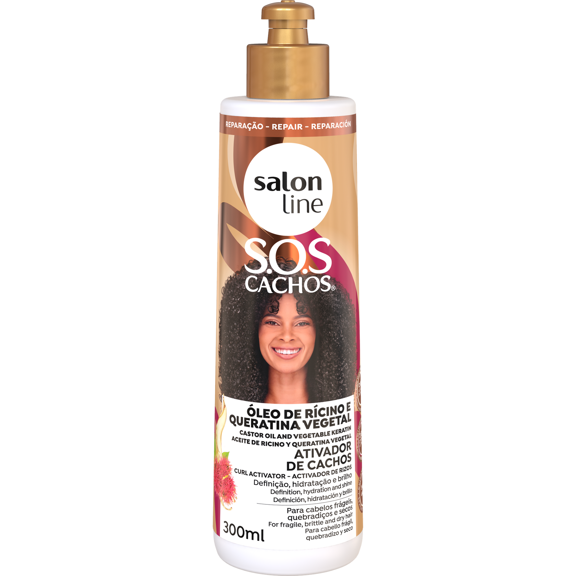 Usa l’Attivatore di Ricci S.O.S Cachos Ricino e Cheratina 300ml come fase finale per ottenere ricci nutriti, ricostruiti e perfettamente definiti.