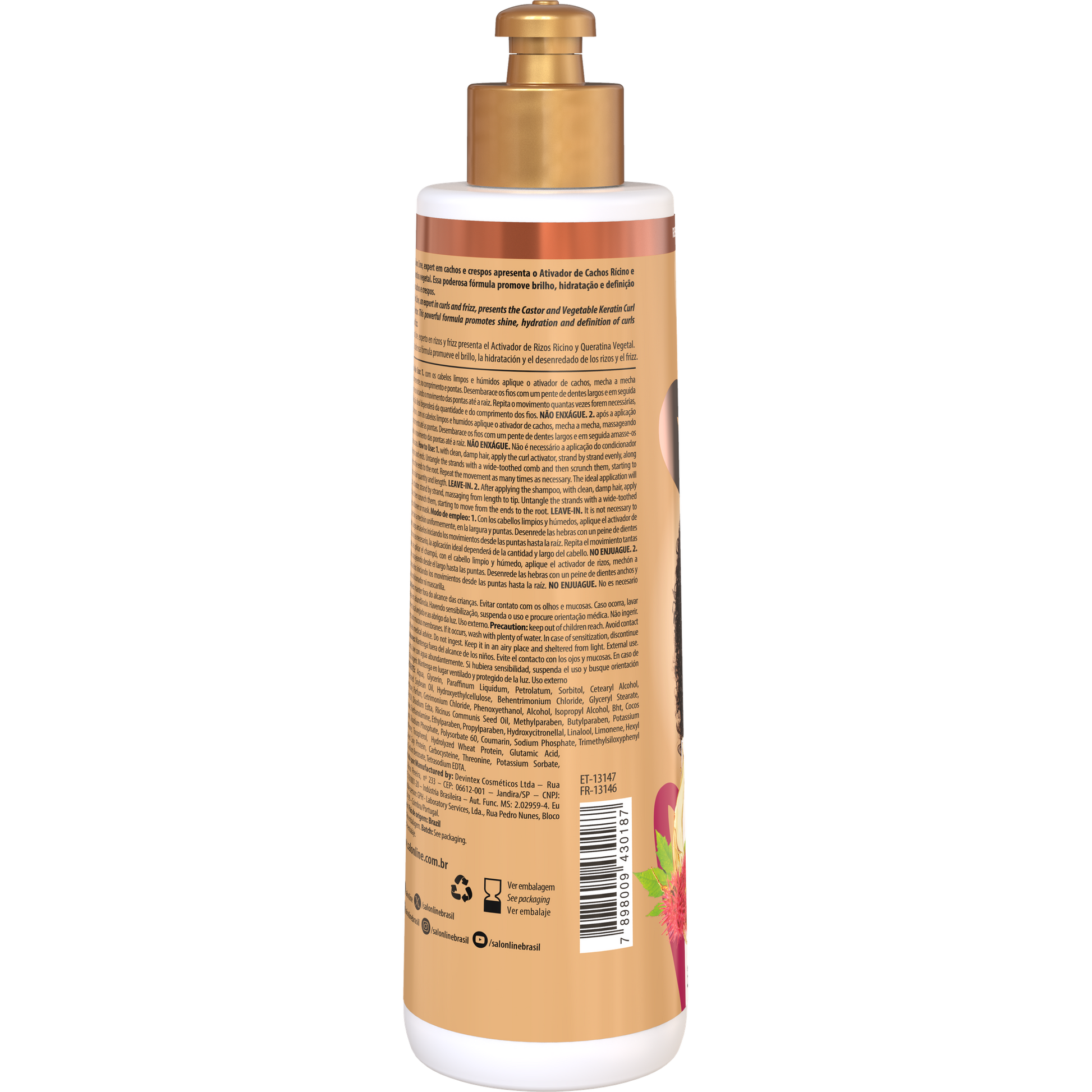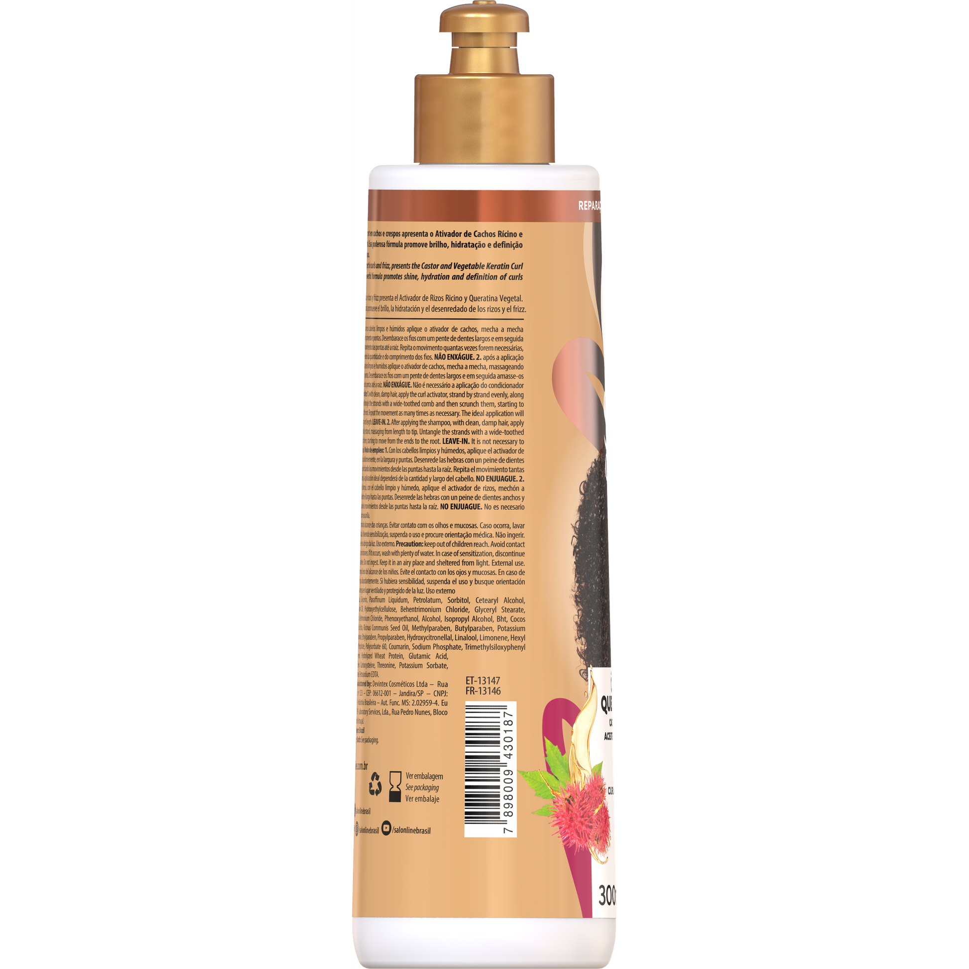 Per un risultato completo, abbina allo shampoo, balsamo, maschera idratante e crema per pettinare della linea S.O.S Cachos Ricino e Cheratina.
